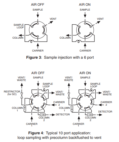 使用随机附带的螺母和卡套,配合外径为 1/16" 的管路,对阀门进行气路连接。(Valco 零死容积配件的说明,请参见注释 503)。确保管道末端清洁、方形切割且无毛刺。如果需要,定量环安装于在 6 通阀上的端口 3 和 6 处,或 10 通阀上的 3 和 10 端口。定量环的体积小至 2µl。